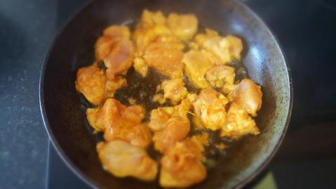 So, firstly marinate the boneless diced pieces with half of the ginger garlic paste and yoghurt. A pinch of turmeric, salt, tandoori masala and kashmiri red chilli powder. Marinate the chicken for approx 15min.